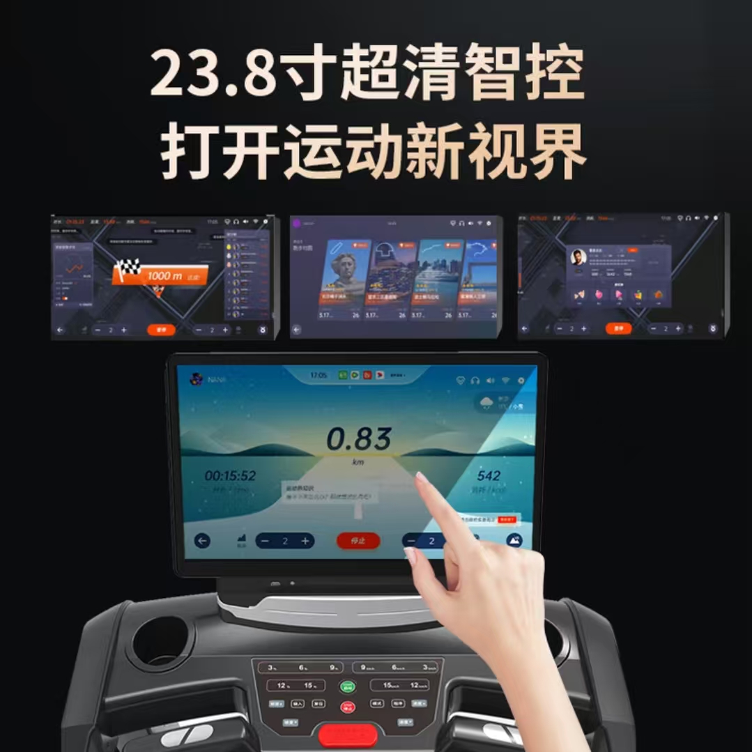 | 承重180kg: | 23.8寸TFT触摸屏 峰值马力7HP 净重233.5kg |